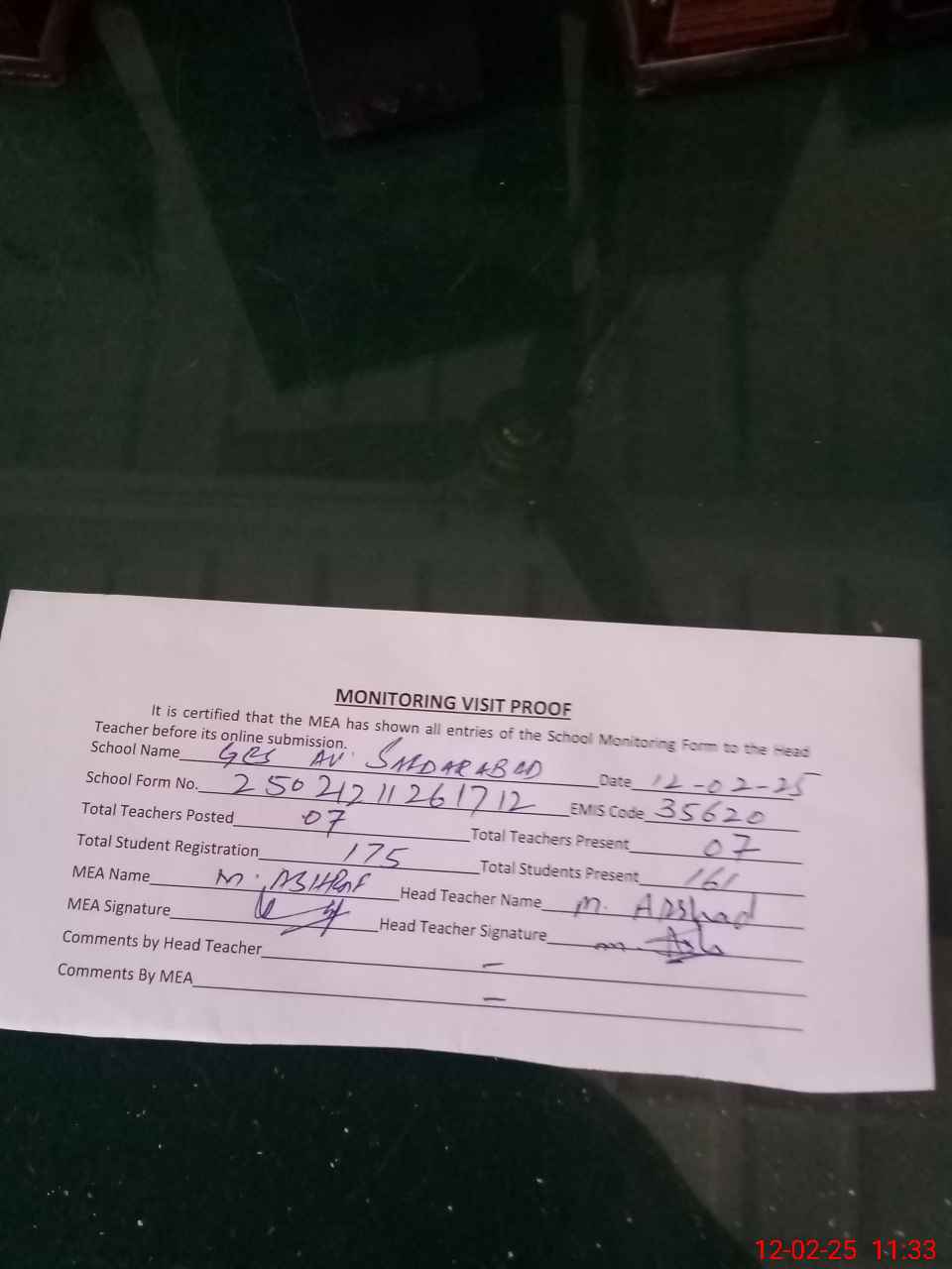 | Attendance Register | Head Teacher | MEA with School | Visit Proof |