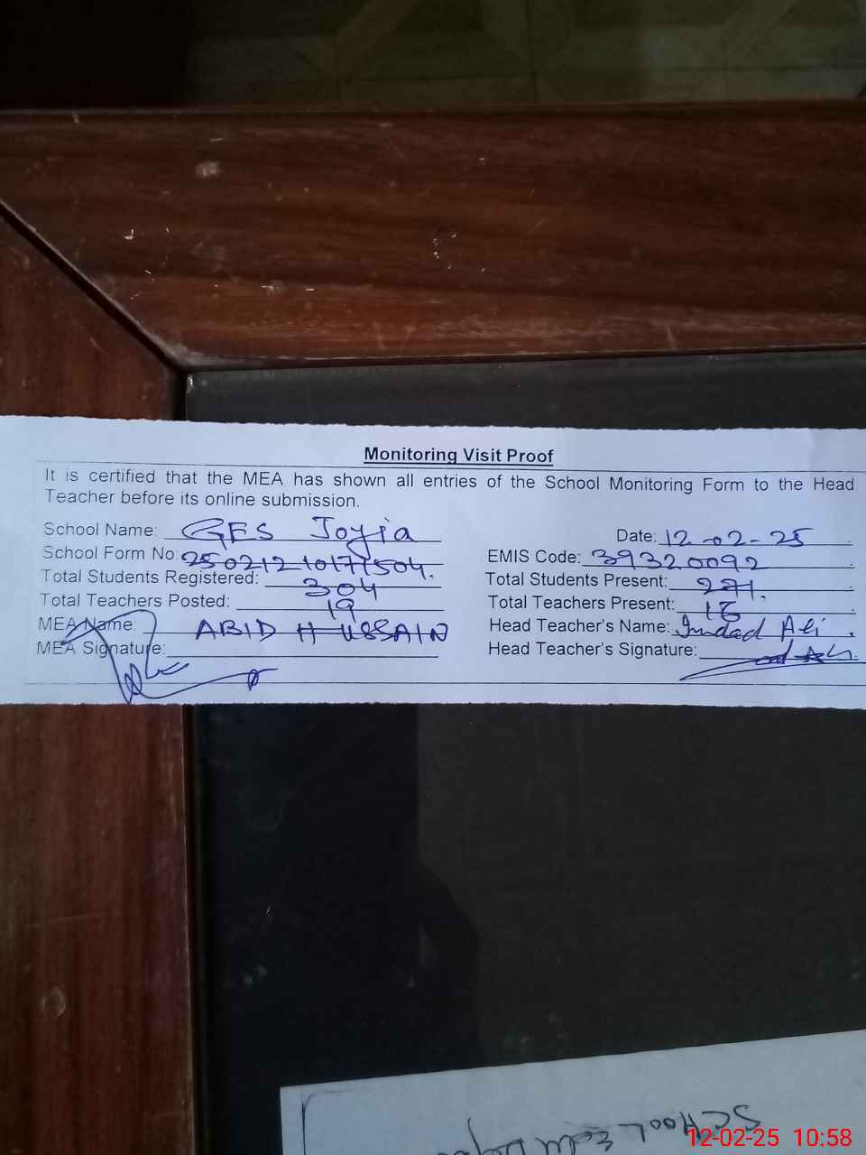 | Certified that this School was Inspected by the Undersigned MEA/DMO Today and the Information Stated Above is as Per Record. | |||||