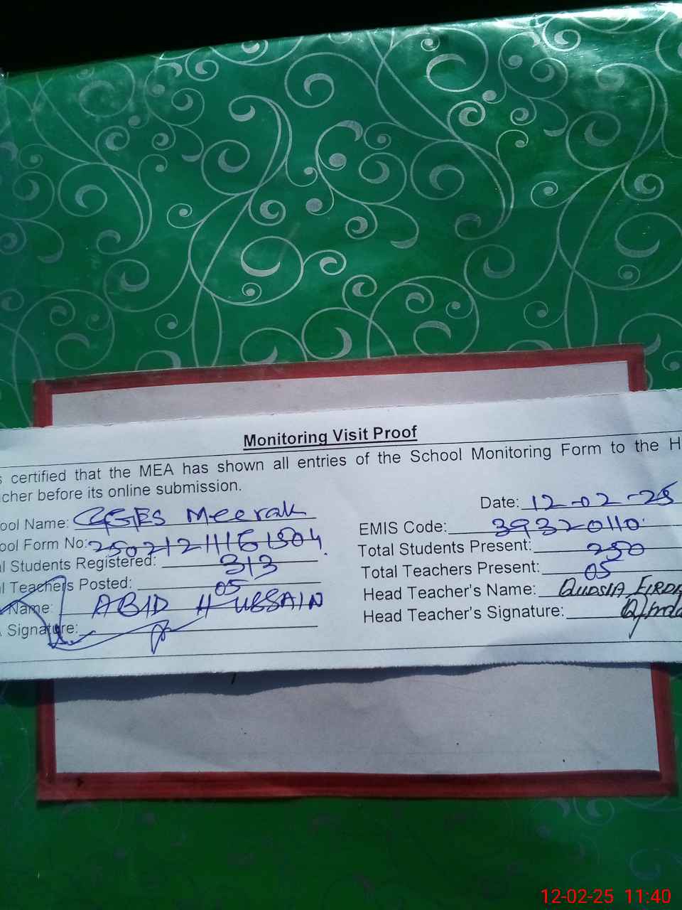 | Attendance Register | Head Teacher | MEA with School | Visit Proof |