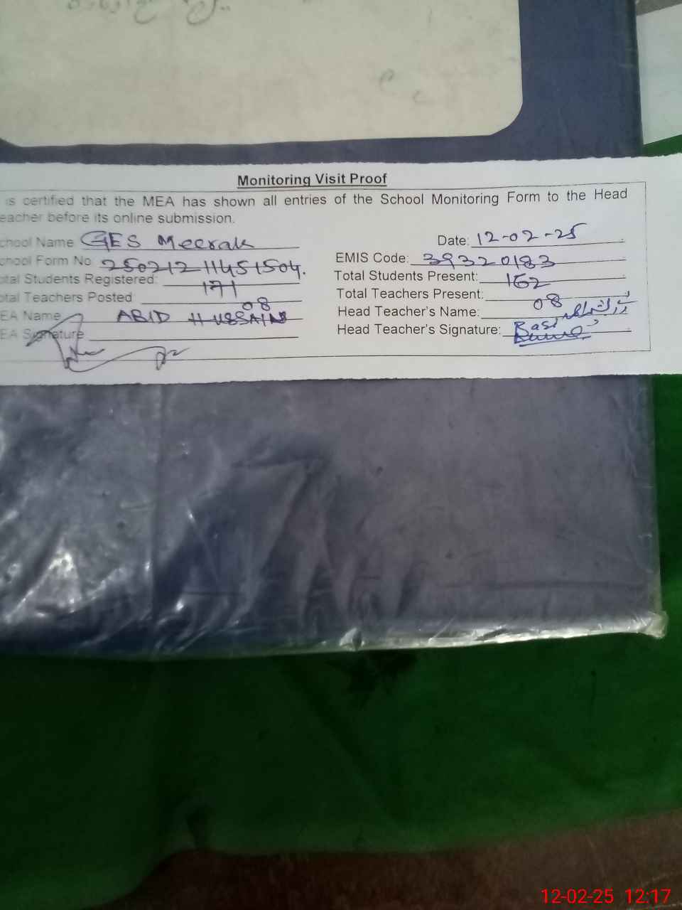 | Attendance Register | Head Teacher | MEA with School | Visit Proof |
