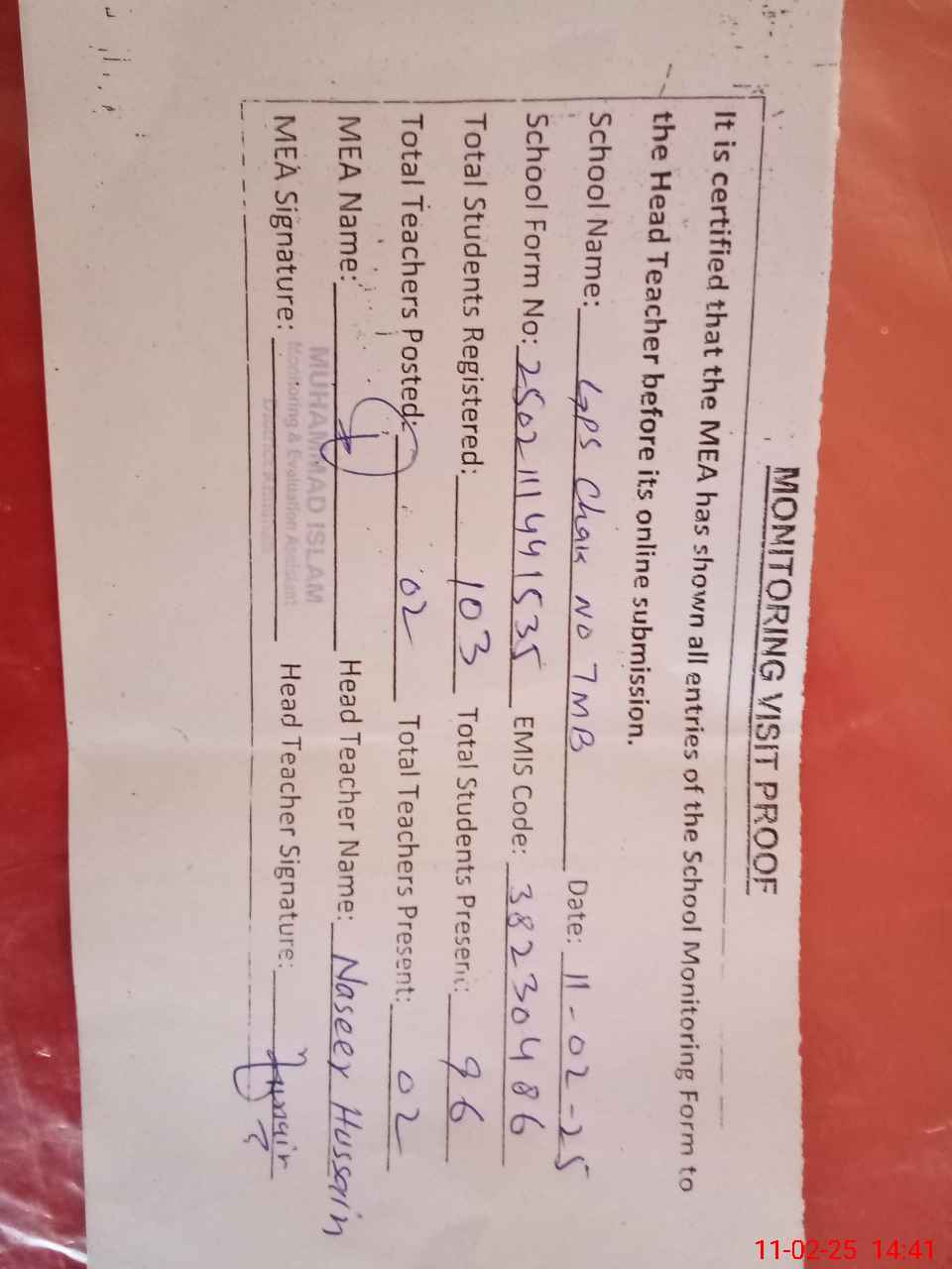 | Attendance Register | Head Teacher | MEA with School | Visit Proof |