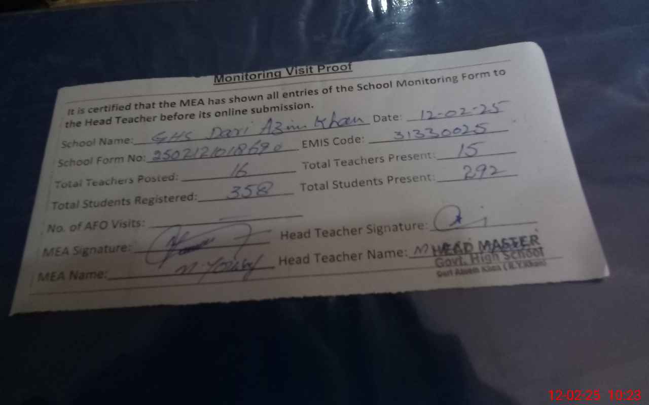 | EMIS Code: 31330025 | Name of School: GHS DARI AZEEM KHAN | |||