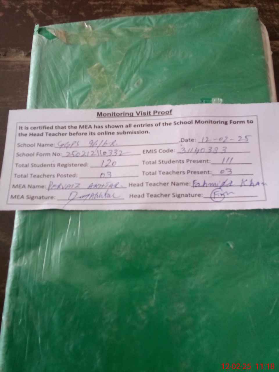 | Attendance Register | Head Teacher | MEA with School | Visit Proof |