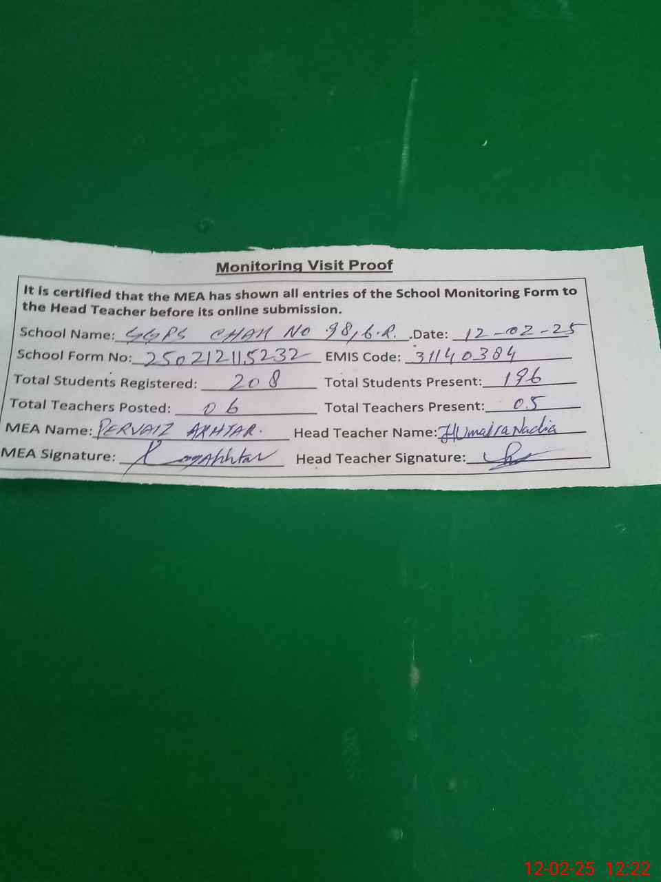 | EMIS Code: 31140384 | Name of School: GGPS CHAK 98/6-R | |||