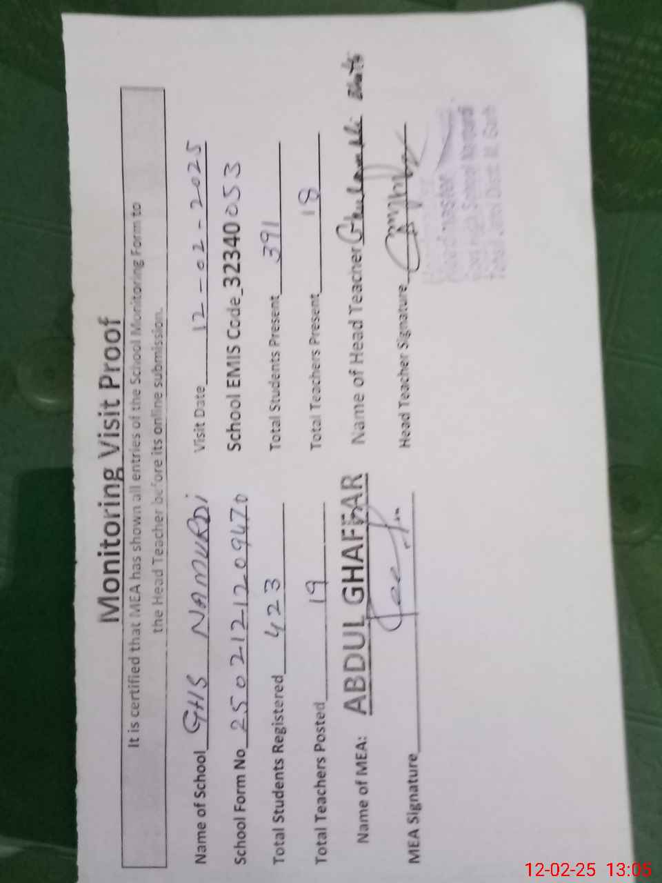 | Attendance Register | Head Teacher | MEA with School | Visit Proof |