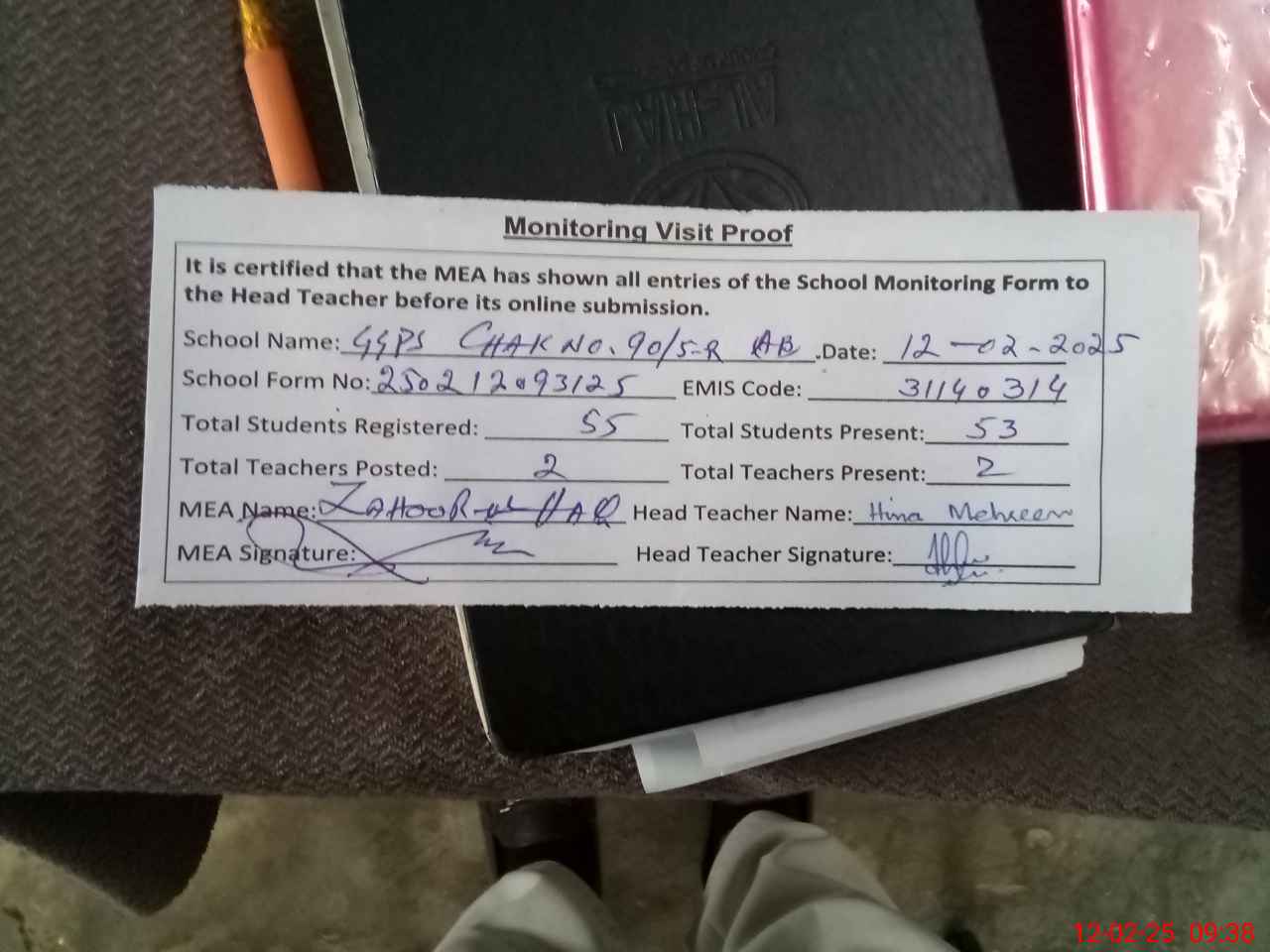 | Attendance Register | Head Teacher | MEA with School | Visit Proof |