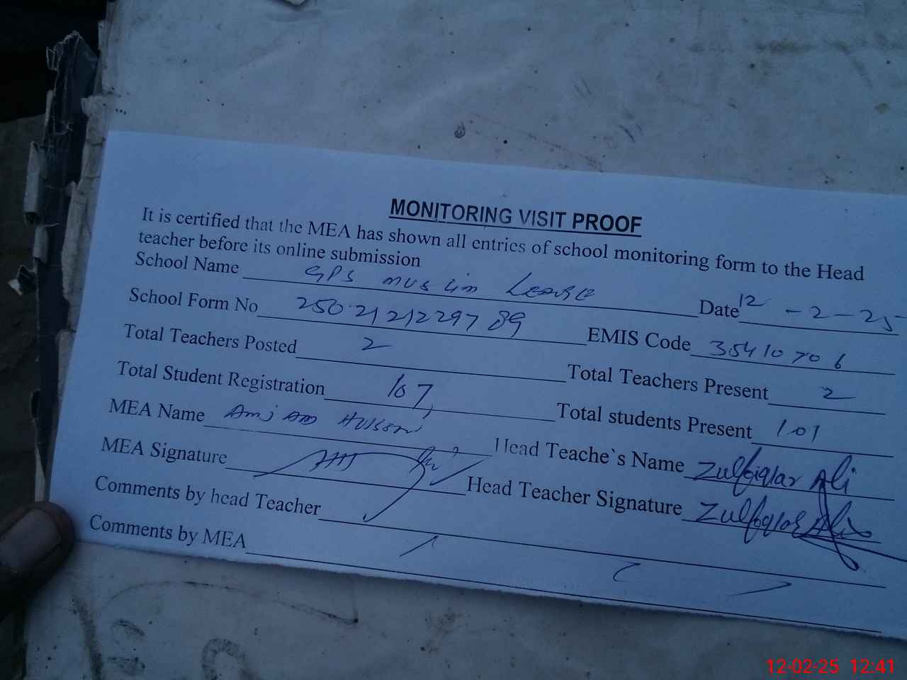 | Attendance Register | Head Teacher | MEA with School | Visit Proof |