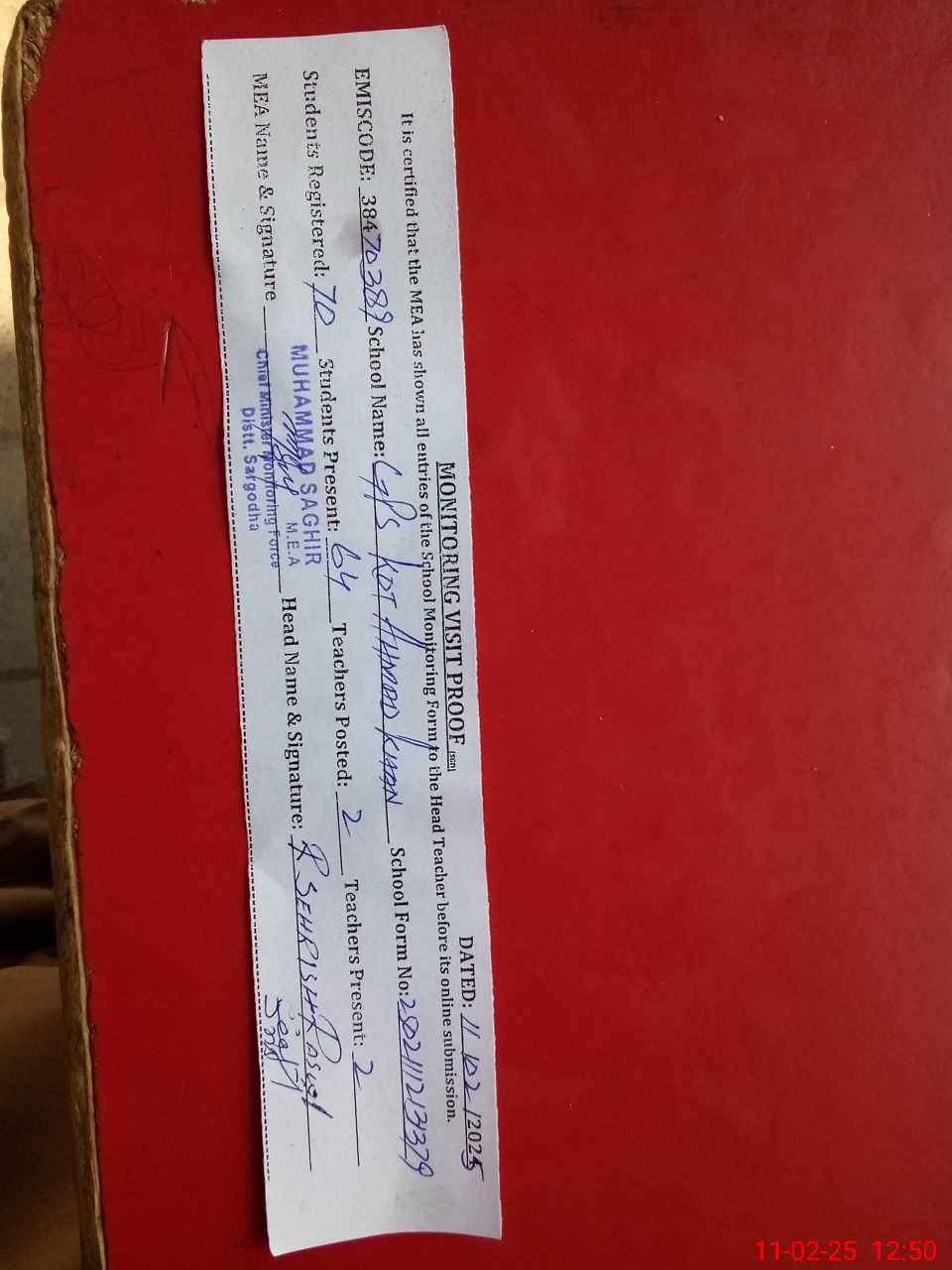 | Attendance Register | Head Teacher | MEA with School | Visit Proof |