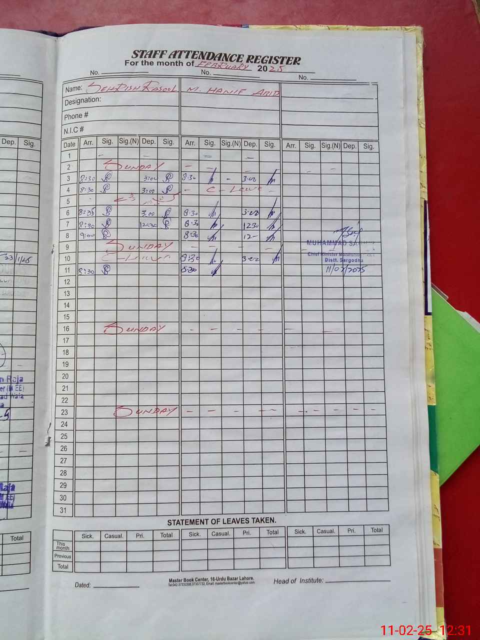 | CNIC | Full Name | Designation | R/C | Absence During Last Calender Month |