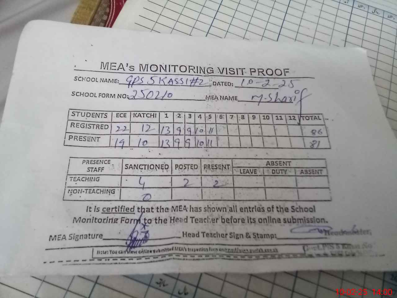 | Attendance Register | Head Teacher | MEA with School | Visit Proof |