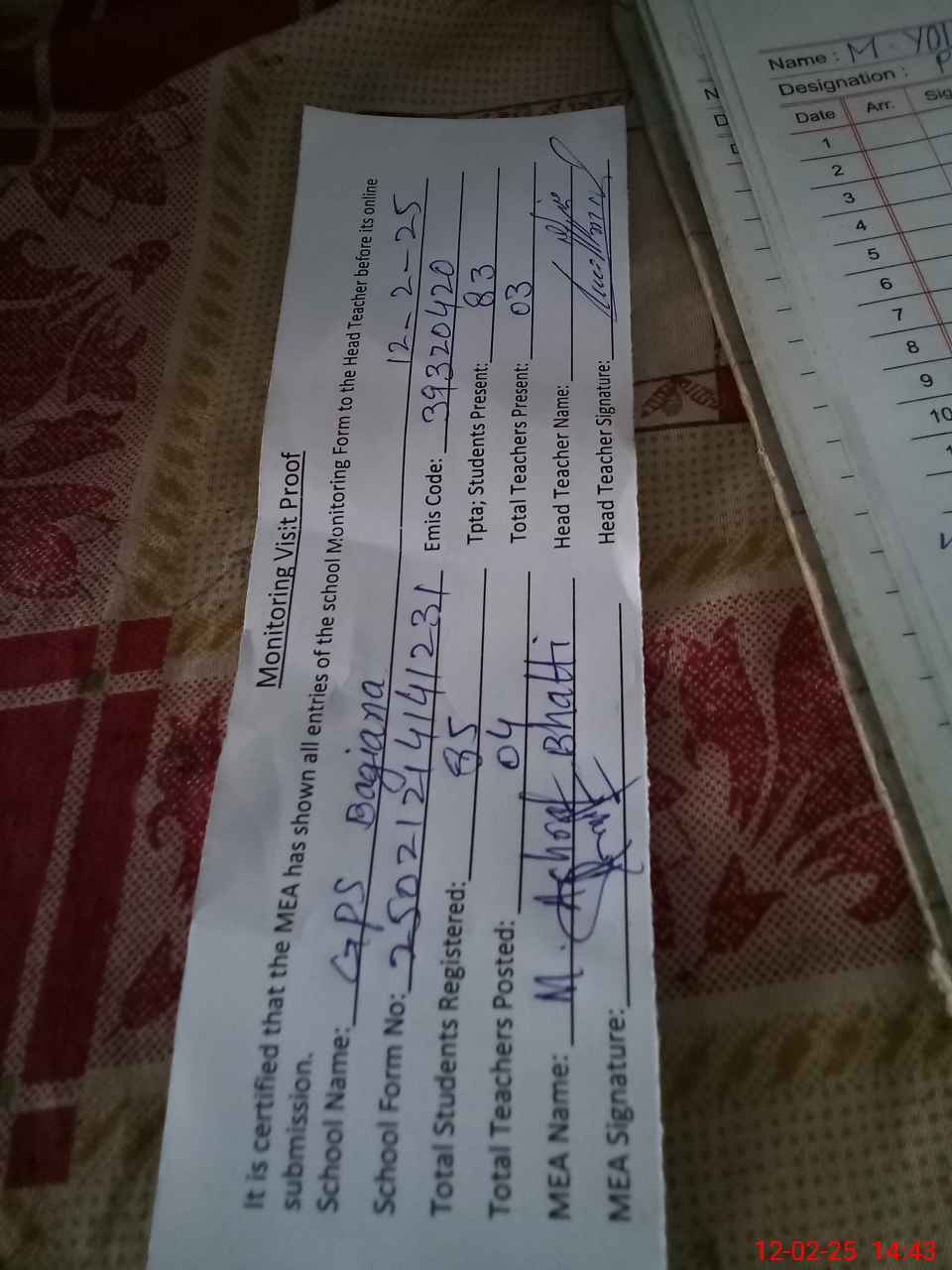 | Attendance Register | Head Teacher | MEA with School | Visit Proof |