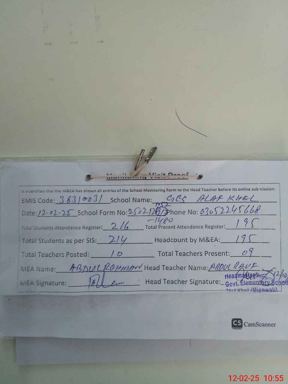 | Attendance Register | Head Teacher | MEA with School | Visit Proof |