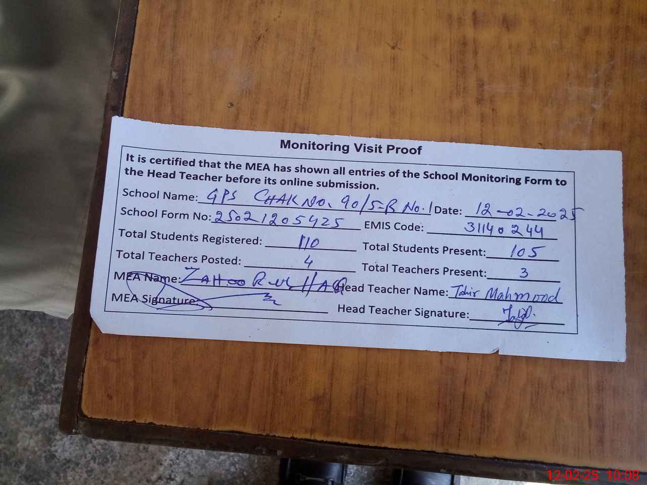 | Attendance Register | Head Teacher | MEA with School | Visit Proof |