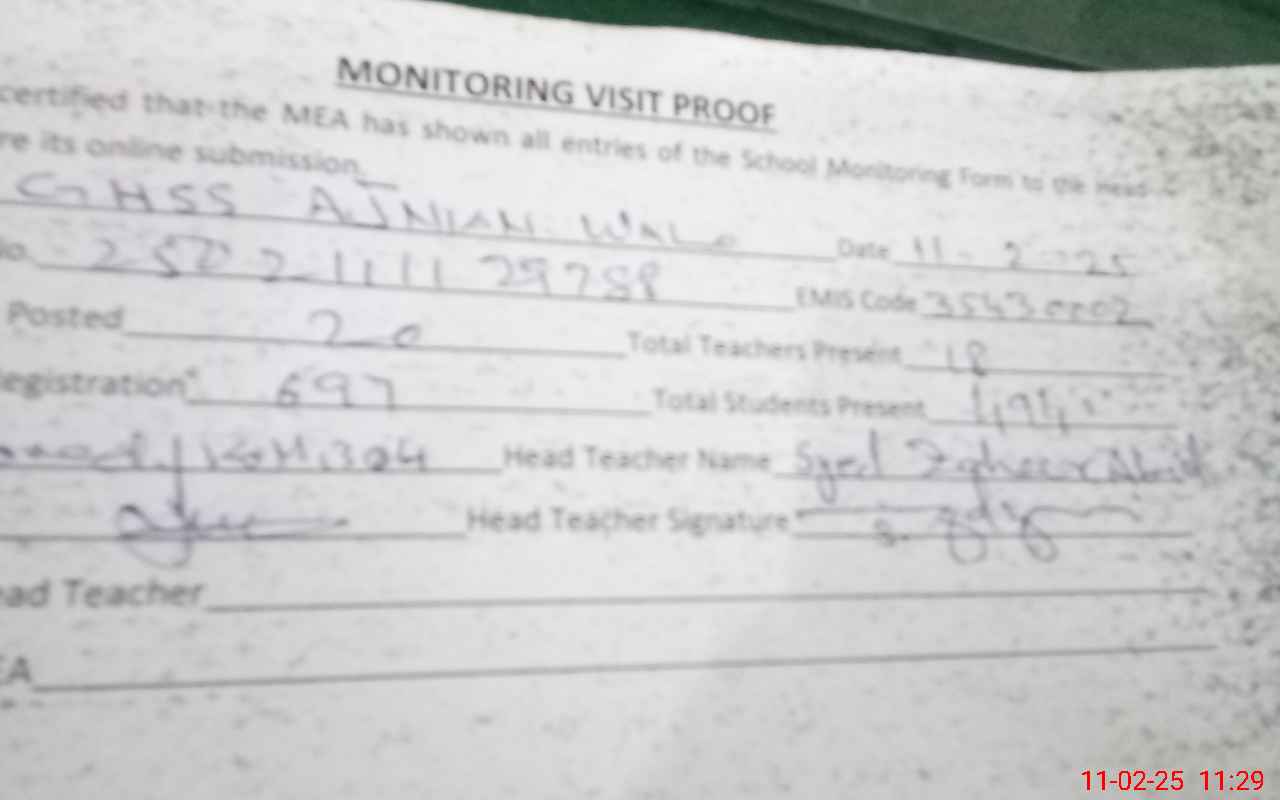 | Attendance Register | Head Teacher | MEA with School | Visit Proof |
