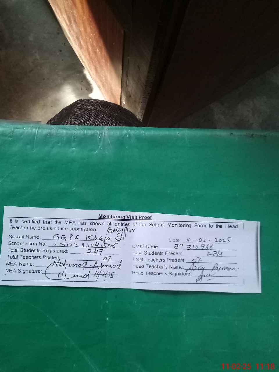 | Certified that this School was Inspected by the Undersigned MEA/DMO Today and the Information Stated Above is as Per Record. | |||||