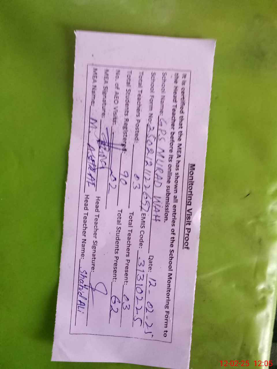 | Attendance Register | Head Teacher | MEA with School | Visit Proof |