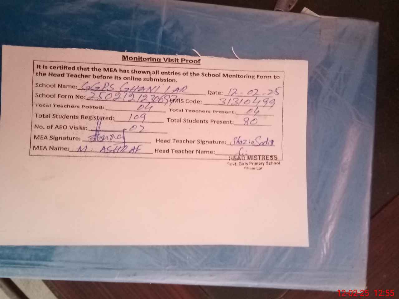 | EMIS Code: 31310499 | Name of School: GGPS GHANI LAR | |||