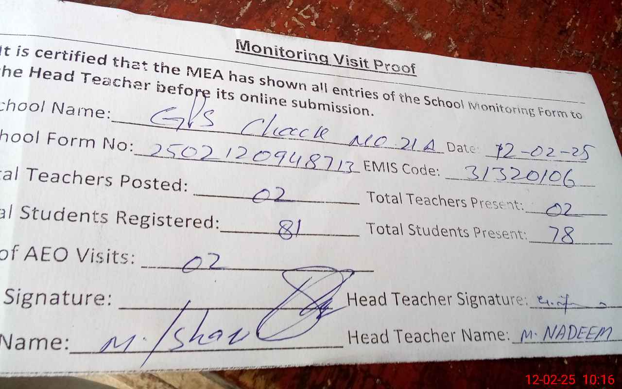 | Attendance Register | Head Teacher | MEA with School | Visit Proof |