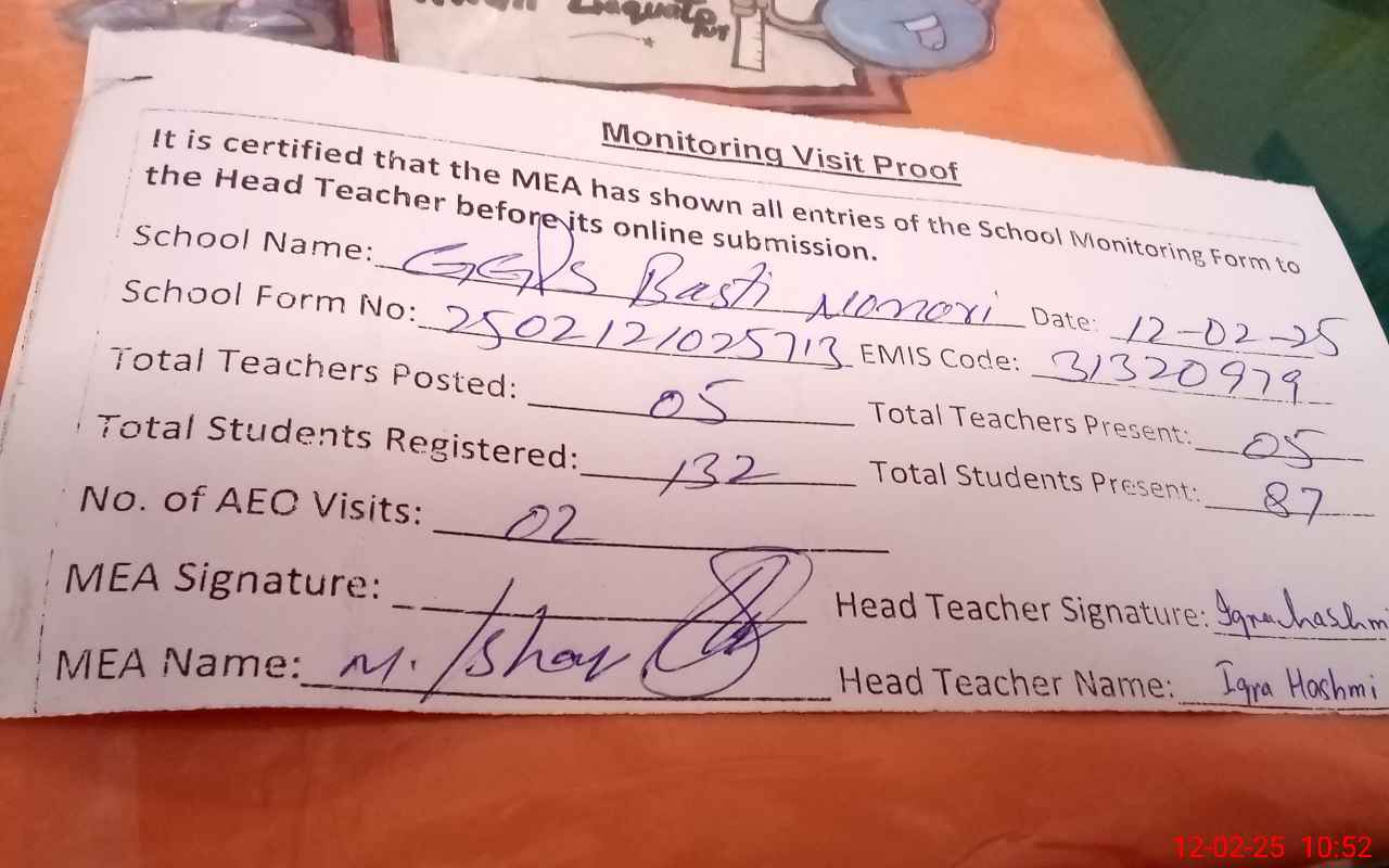 | Certified that this School was Inspected by the Undersigned MEA/DMO Today and the Information Stated Above is as Per Record. | |||||