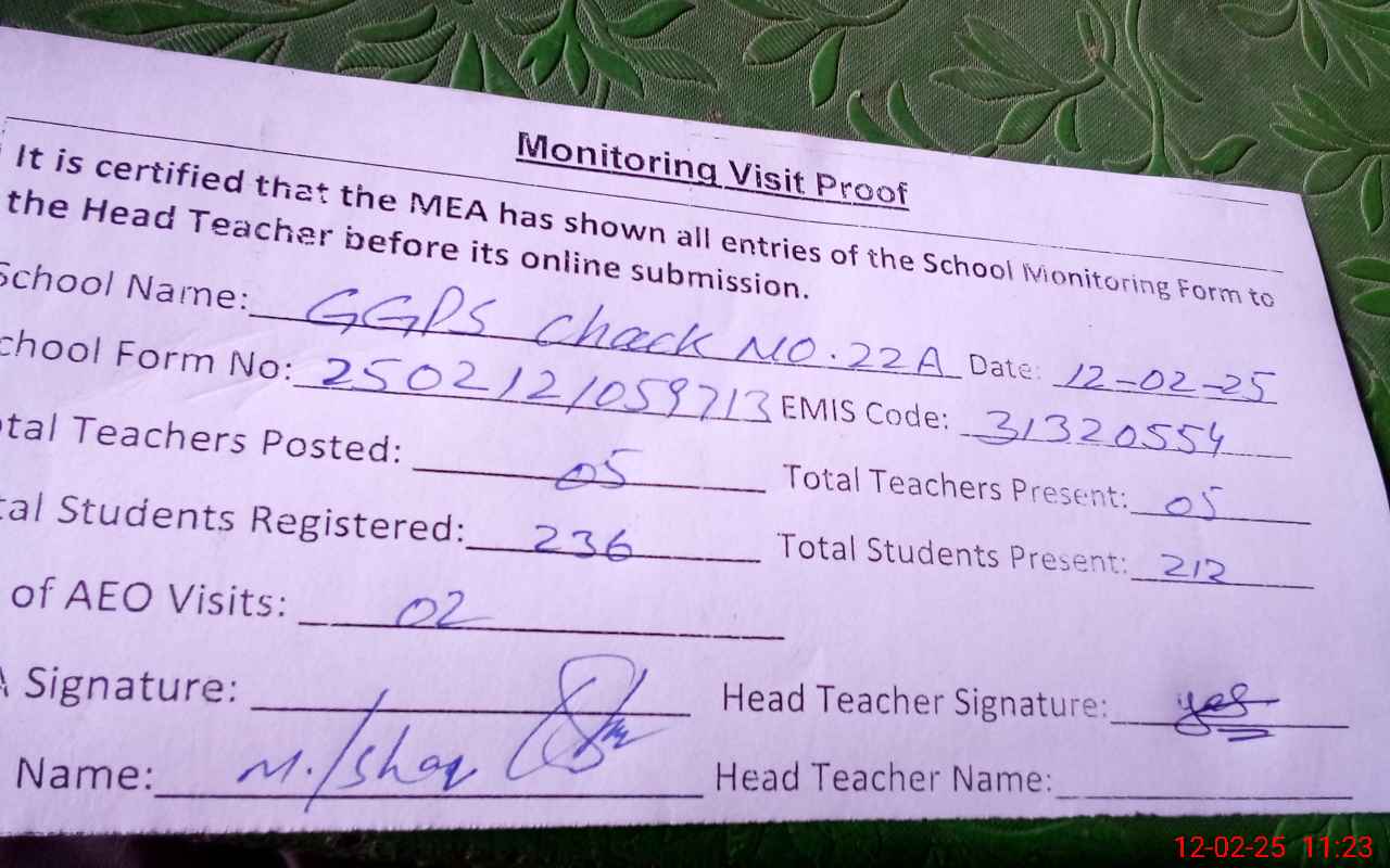| EMIS Code: 31320554 | Name of School: GGPS CHAK NO 22/A | |||