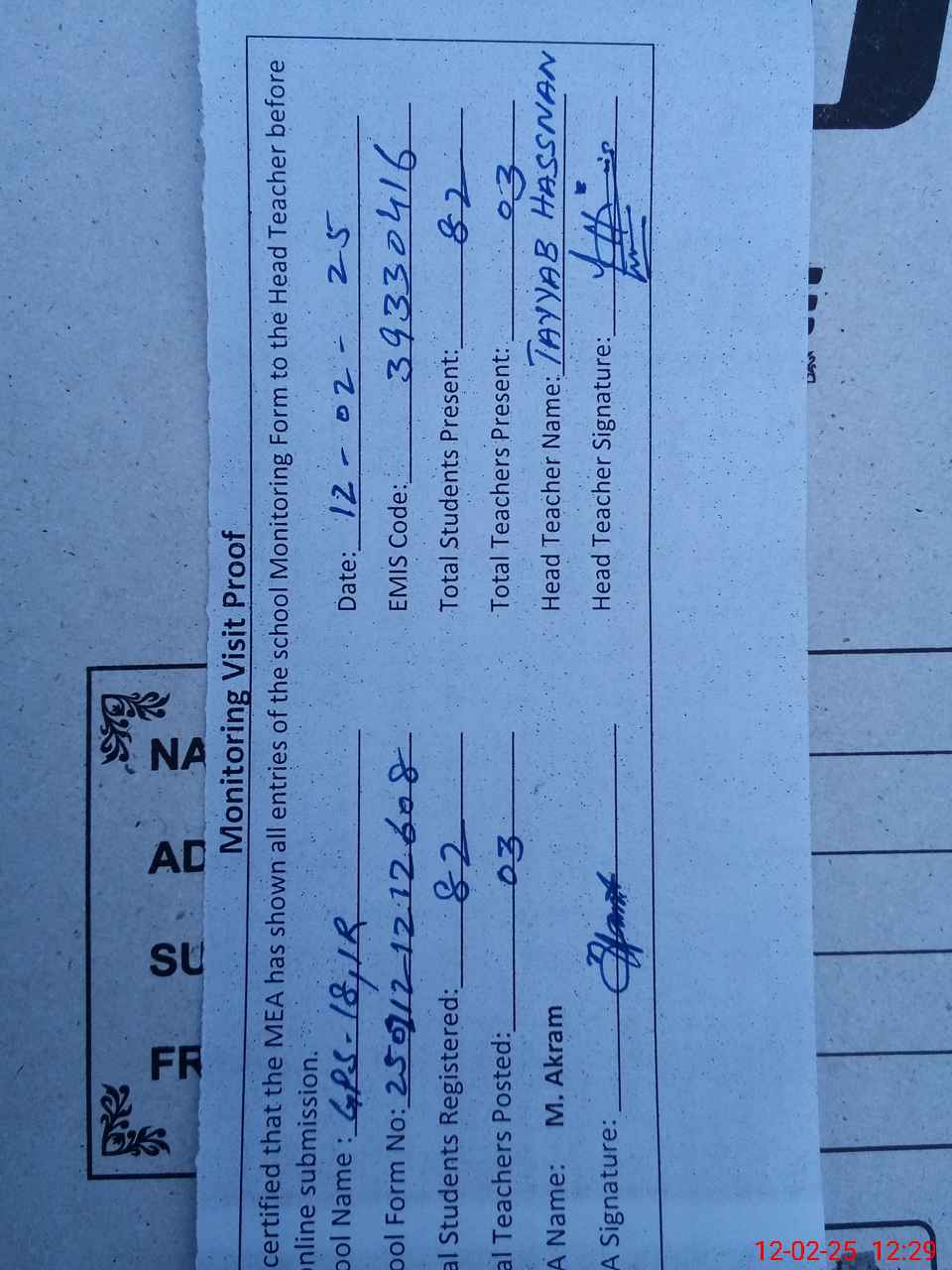 | EMIS Code: 39330416 | Name of School: GPS CHAK NO. 18/1-R | |||