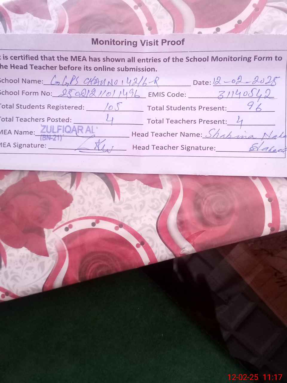 | EMIS Code: 31140542 | Name of School: GGPS CHAK NO. 142/6-R A.B | |||