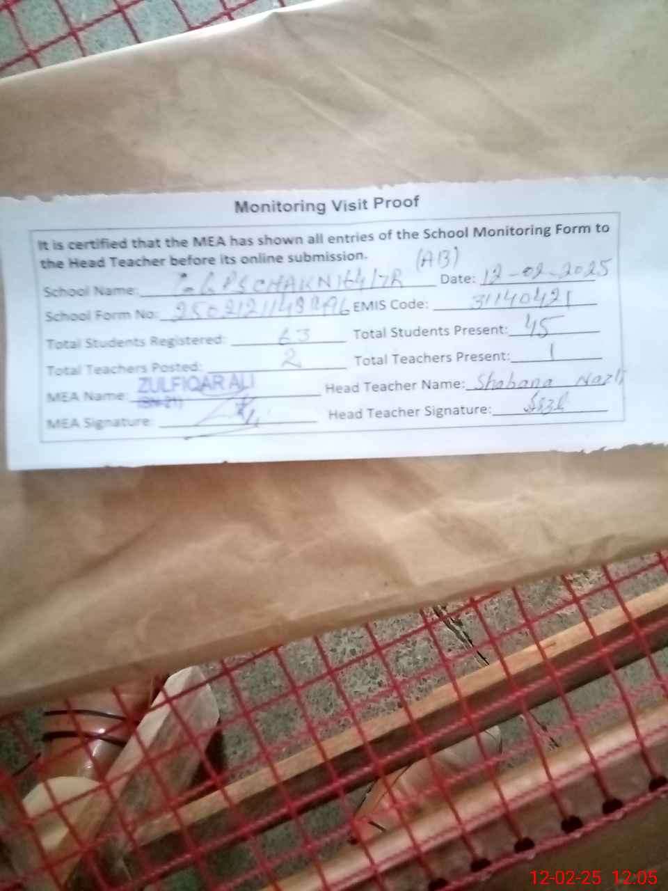 | Attendance Register | Head Teacher | MEA with School | Visit Proof |