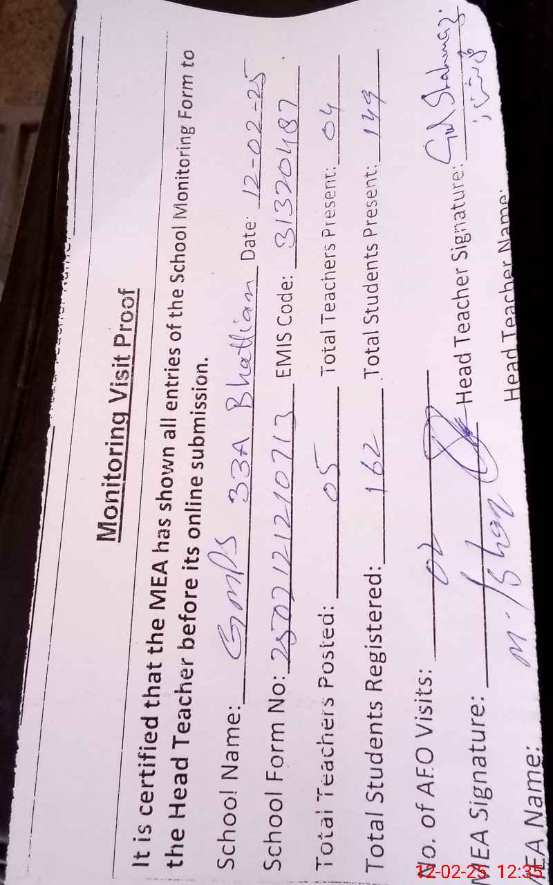 | EMIS Code: 31320487 | Name of School: GMPS CHAK NO. 33/A BHUTTIAN | |||
