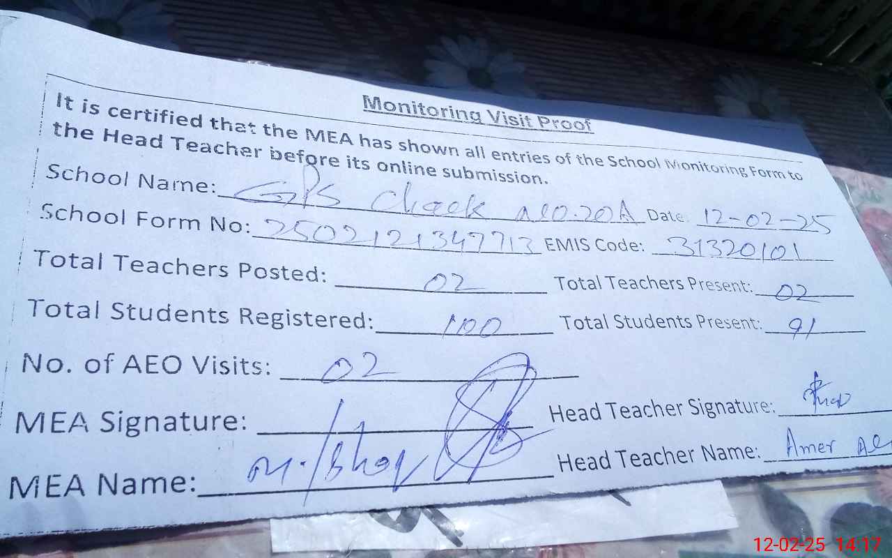 | Attendance Register | Head Teacher | MEA with School | Visit Proof |
