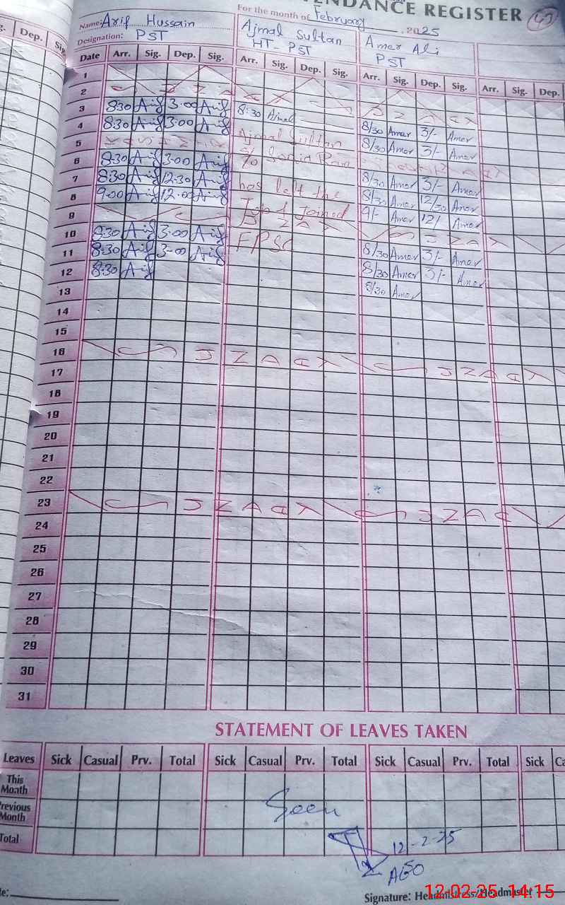 | Name: AM**** AL**** Designation: (School Headmaster's/Headmistress's) PST Phone/Cell Number: 03**** |