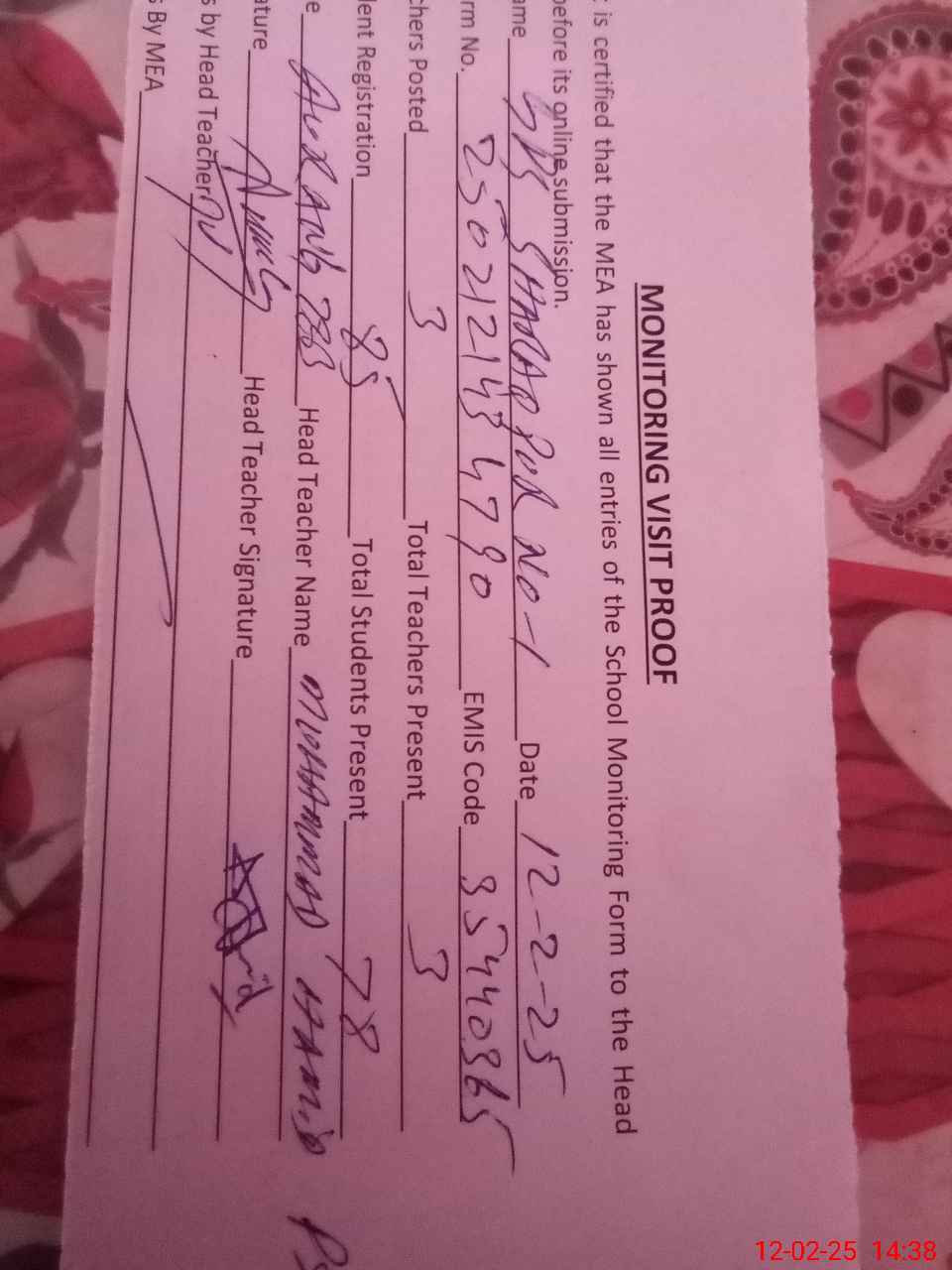 | Attendance Register | Head Teacher | MEA with School | Visit Proof |