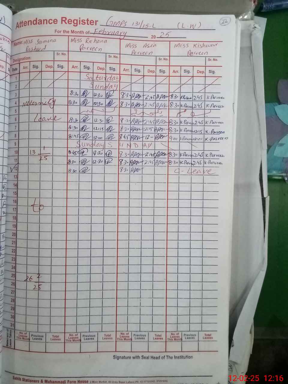 | Leave | Duty | Absent | Maternity | Medical | Ex- Pak |