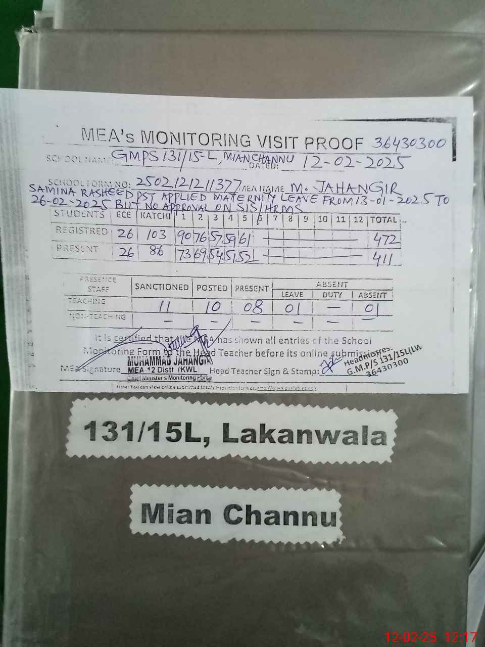 | Attendance Register | Head Teacher | MEA with School | Visit Proof |