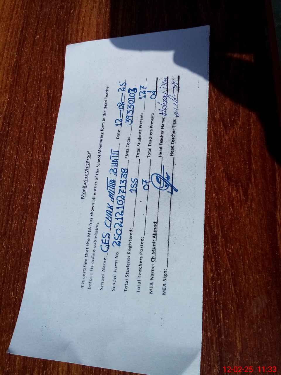 | Attendance Register | Head Teacher | MEA with School | Visit Proof |