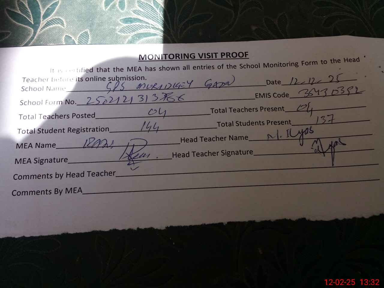 | Attendance Register | Head Teacher | MEA with School | Visit Proof |