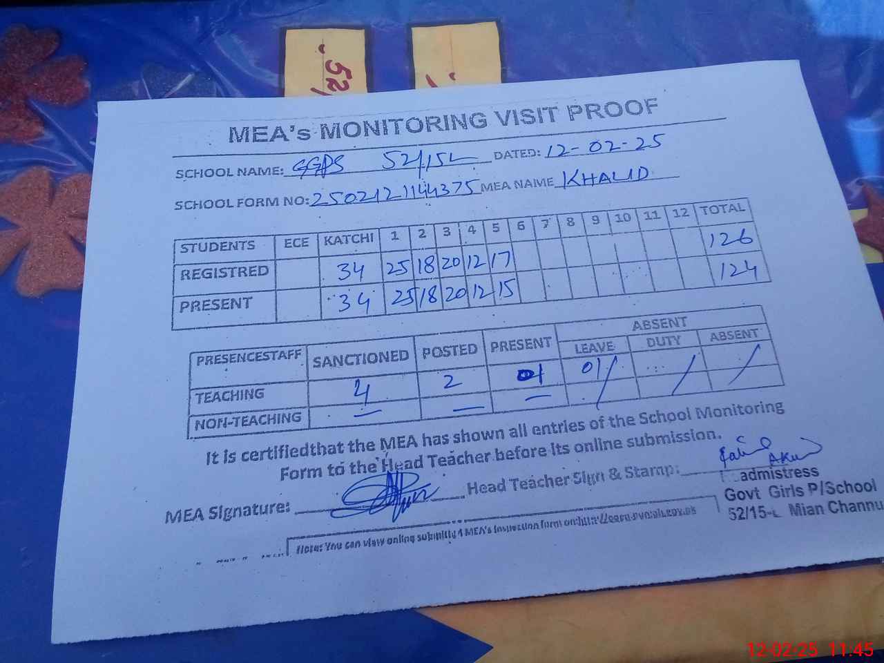| Attendance Register | Head Teacher | MEA with School | Visit Proof |