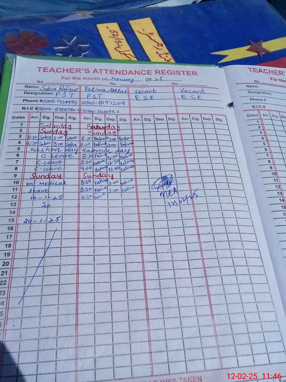 | CNIC | Full Name | Designation | R/C | Absence During Last Calender Month |