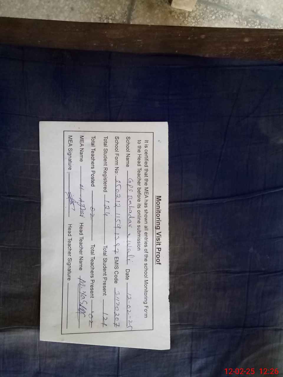 | EMIS Code: 31120207 | Name of School: GPS BAHADAR WALI | |||