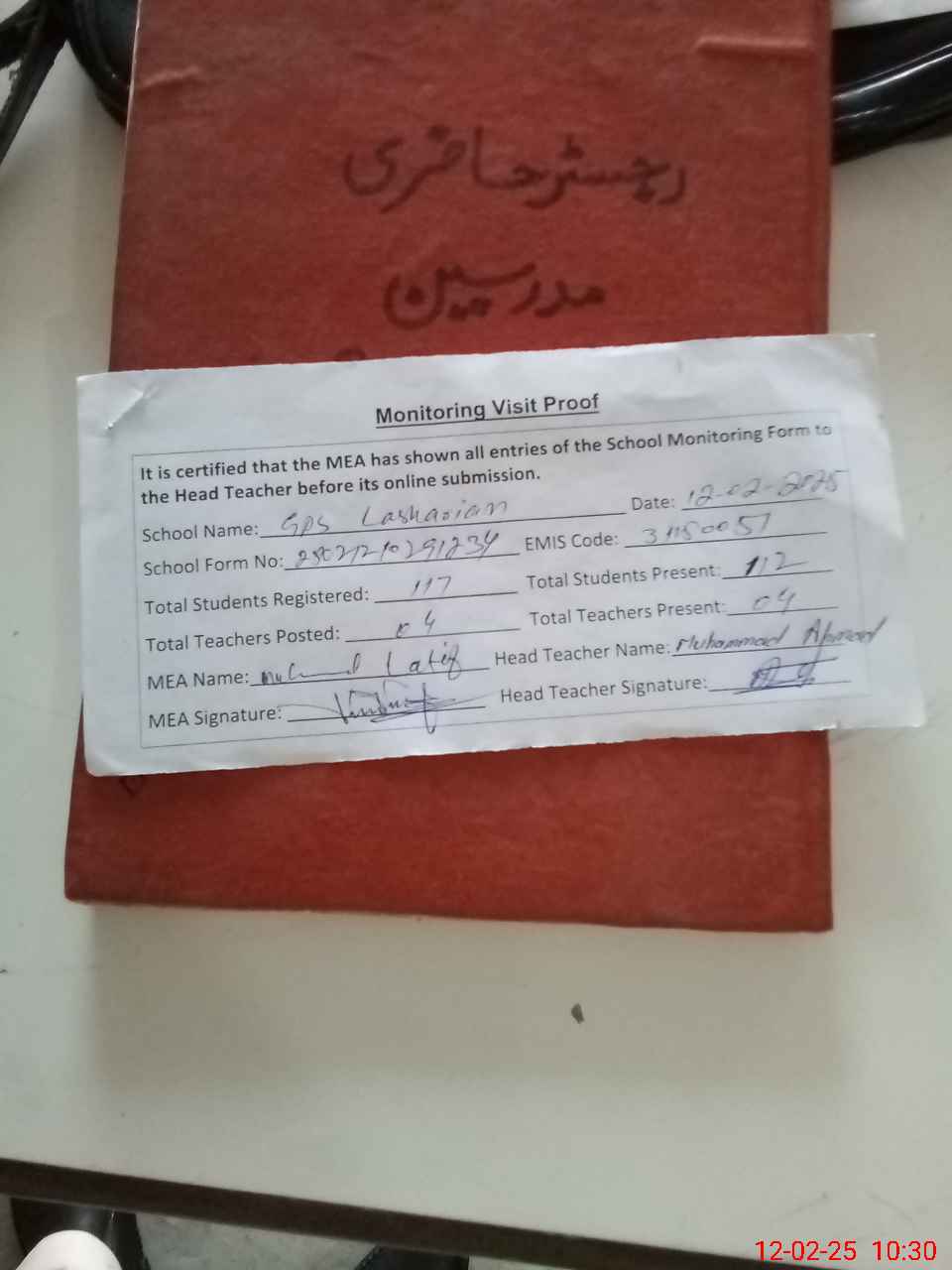 | Attendance Register | Head Teacher | MEA with School | Visit Proof |