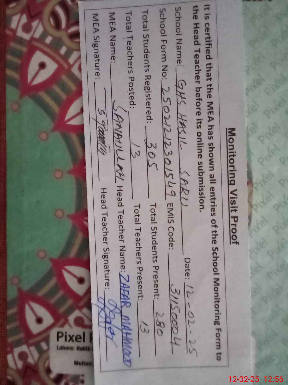 | Attendance Register | Head Teacher | MEA with School | Visit Proof |