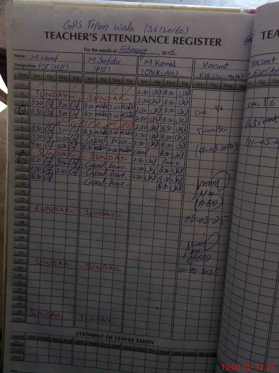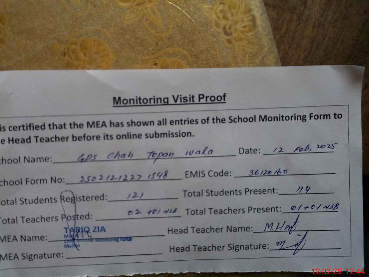 | Attendance Register | Head Teacher | MEA with School | Visit Proof |