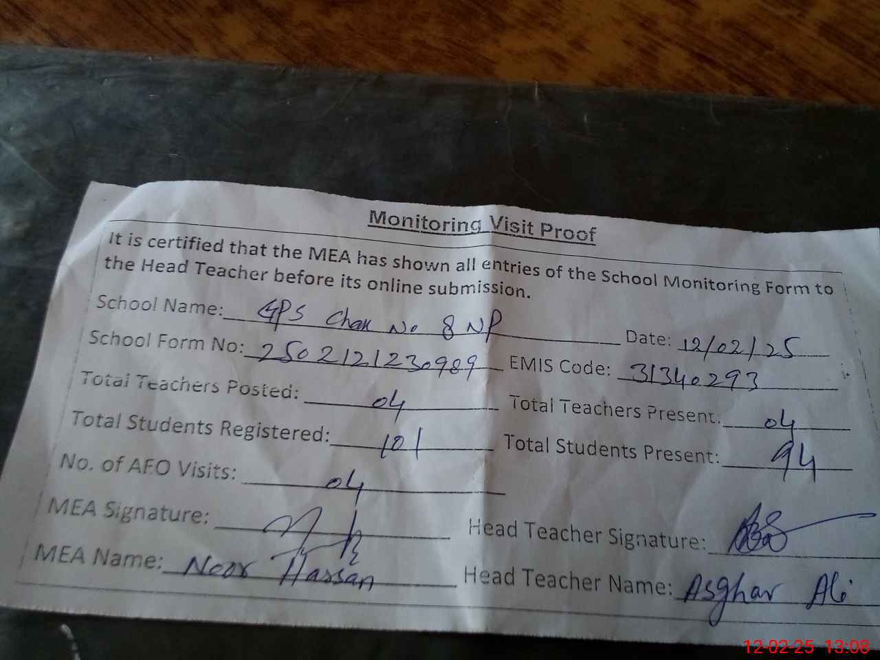 | Attendance Register | Head Teacher | MEA with School | Visit Proof |