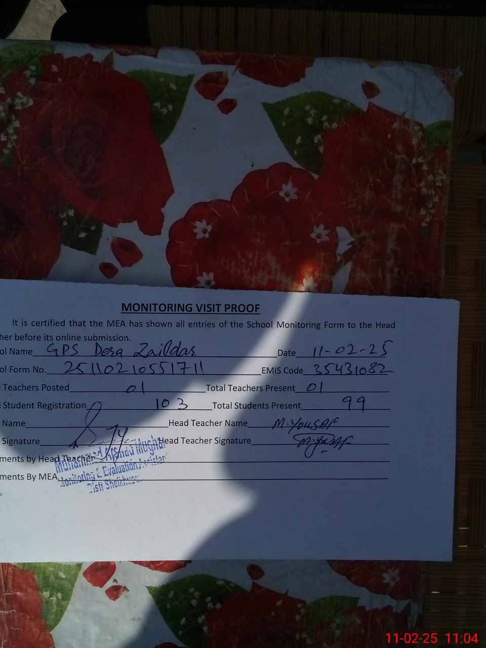 | Attendance Register | Head Teacher | MEA with School | Visit Proof |