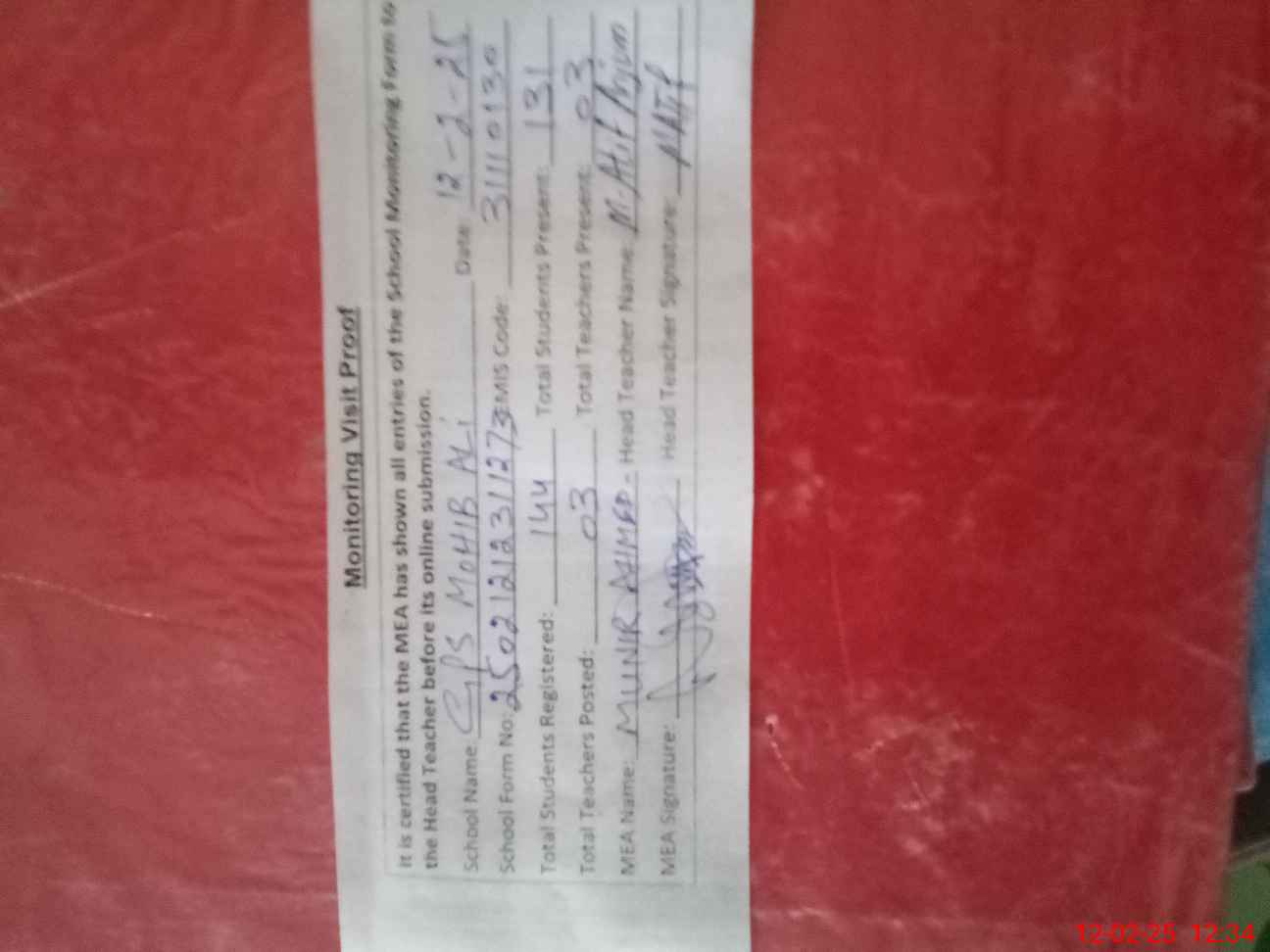 | Attendance Register | Head Teacher | MEA with School | Visit Proof |