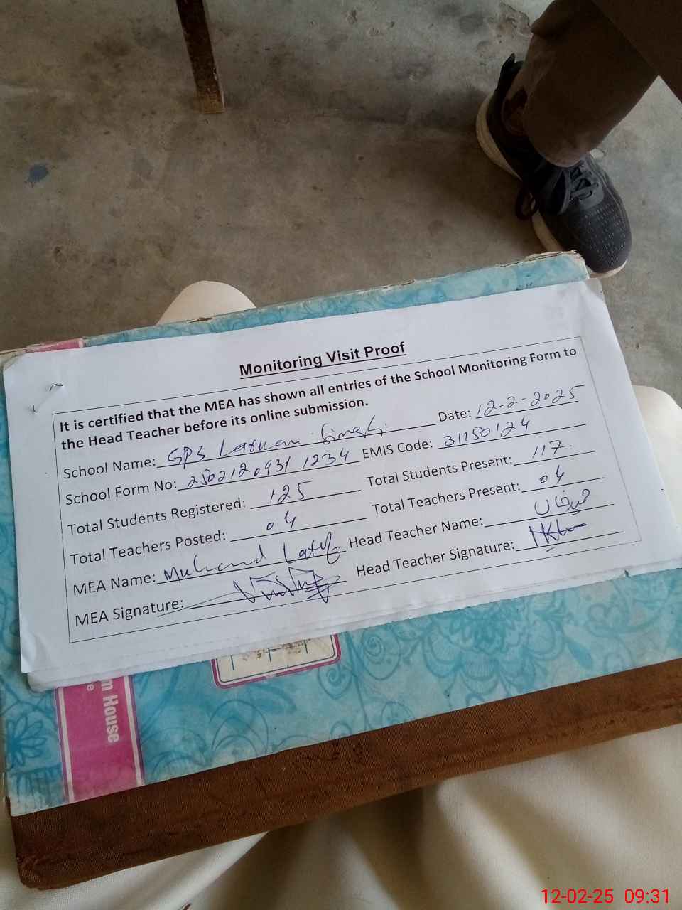 | Attendance Register | Head Teacher | MEA with School | Visit Proof |