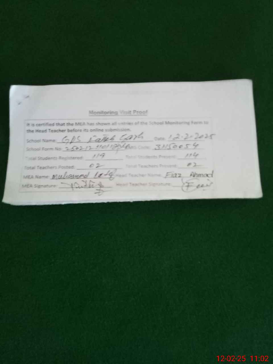 | Attendance Register | Head Teacher | MEA with School | Visit Proof |