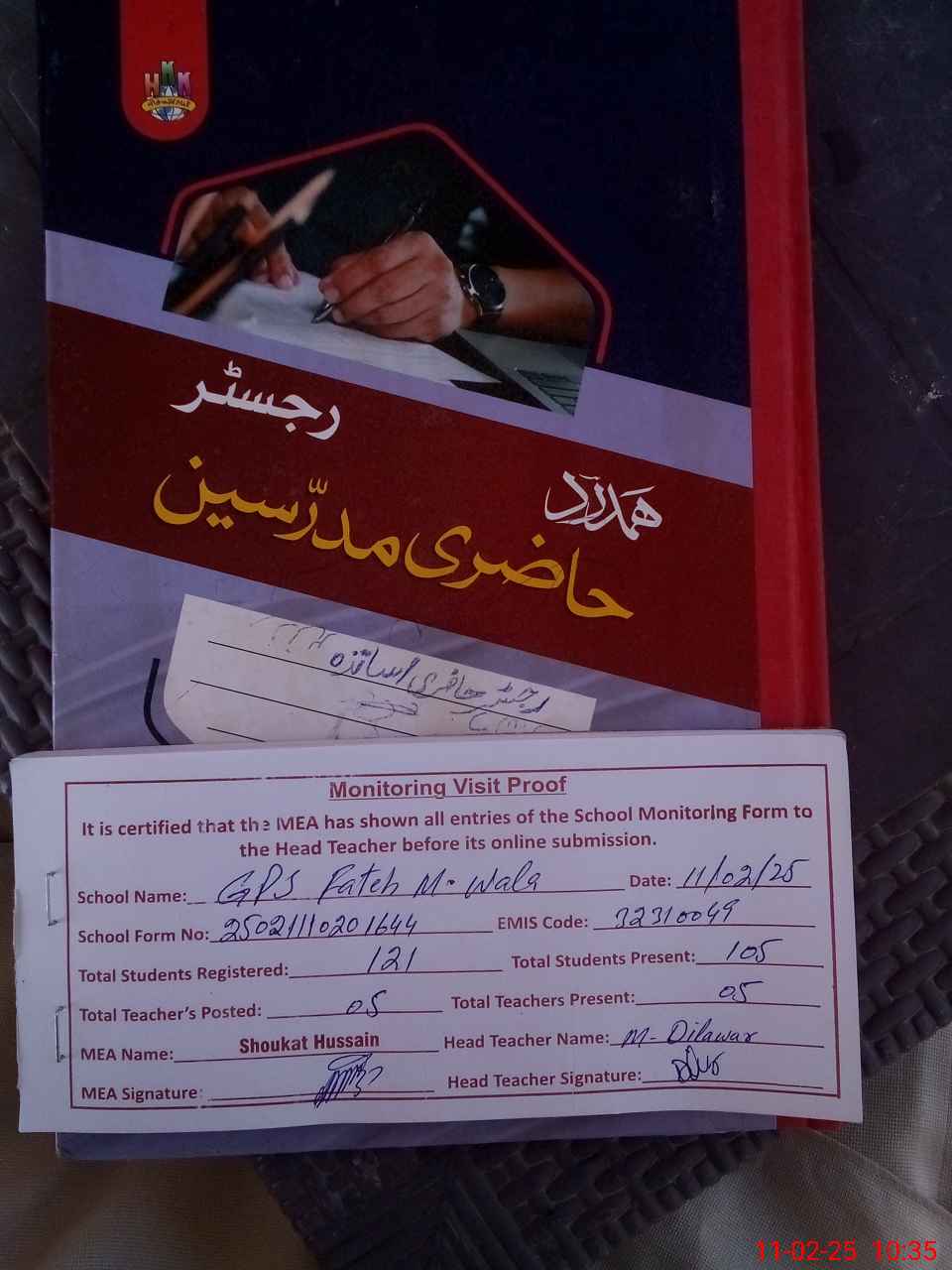 | Attendance Register | Head Teacher | MEA with School | Visit Proof |