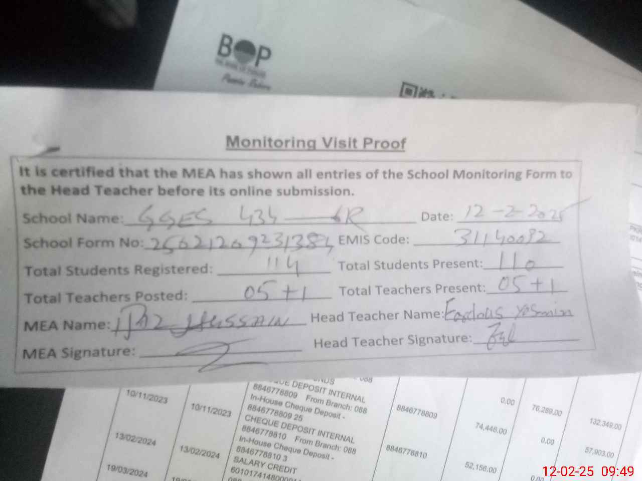 | Attendance Register | Head Teacher | MEA with School | Visit Proof |