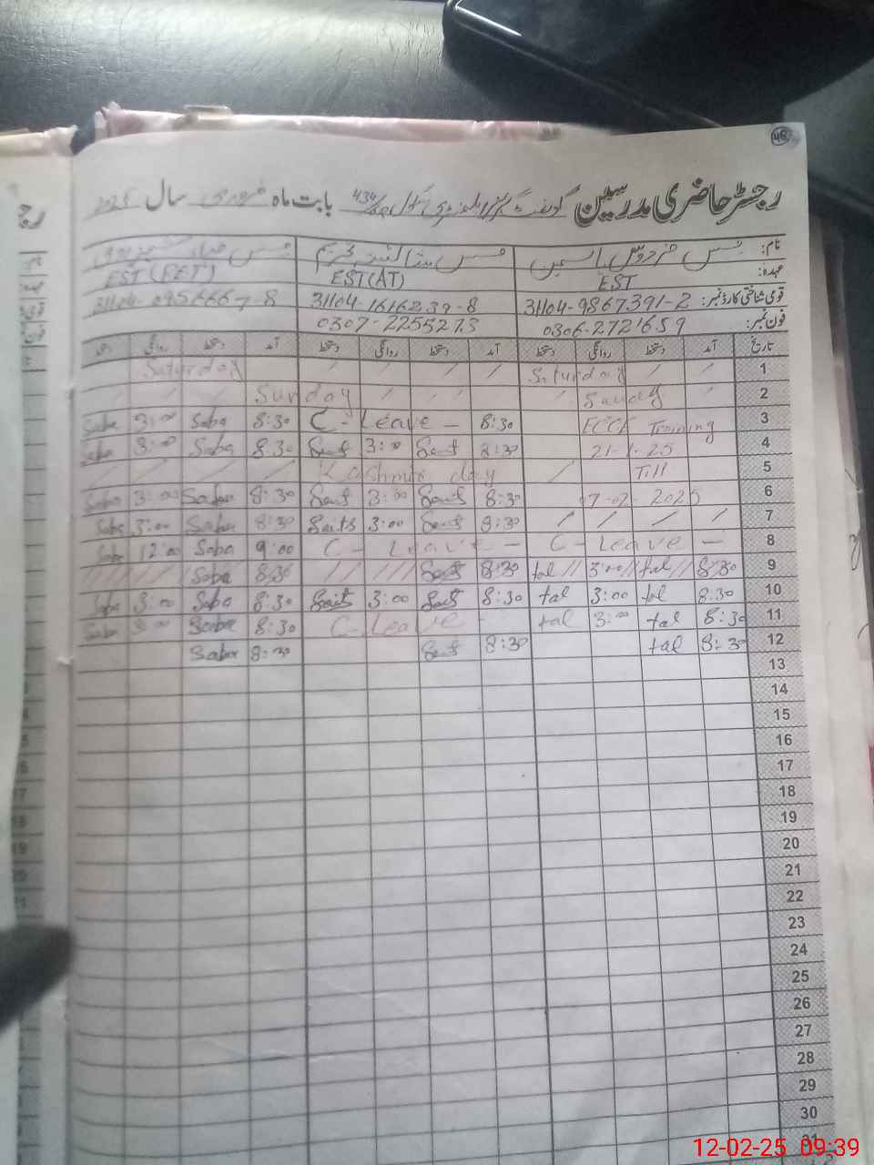 | CNIC | Full Name | Designation | R/C | Absence During Last Calender Month |