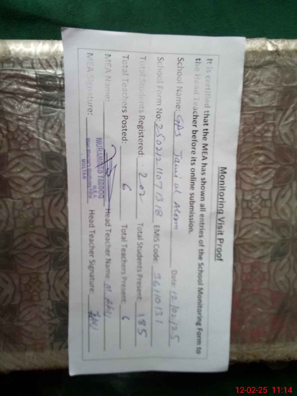 | Attendance Register | Head Teacher | MEA with School | Visit Proof |